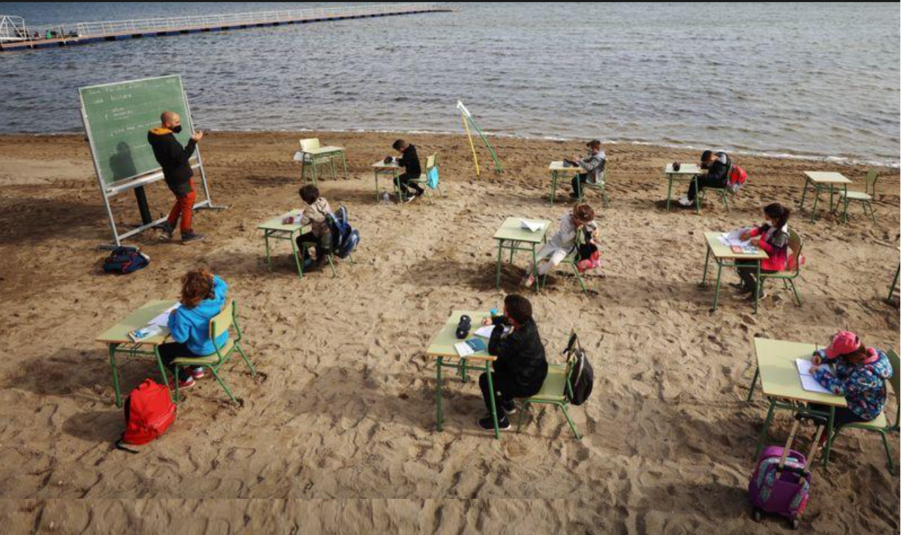 LOS NIETOS, Spain (Reuters) – Does having school at the beach sound like a dream? After a year of remote learning and socially distanced classrooms, one school in the Spanish region of Murcia is doing just that, trying to combine clear air and a new way of teaching.